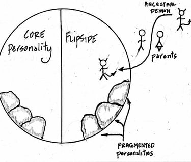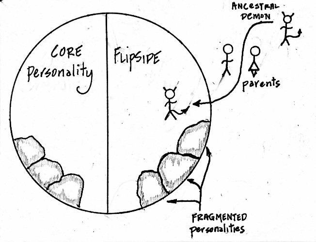 Unlike a fragmented personality whose personality and age are frozen in time at the moment of fragmentation, the flip side matures and ages in tandem with the core personality. He carries the lion’s share of iniquities, surrendered ground, and strongholds held by the ancestral demon; therefore, the flipside personality is carefully guarded by the ancestral demon.